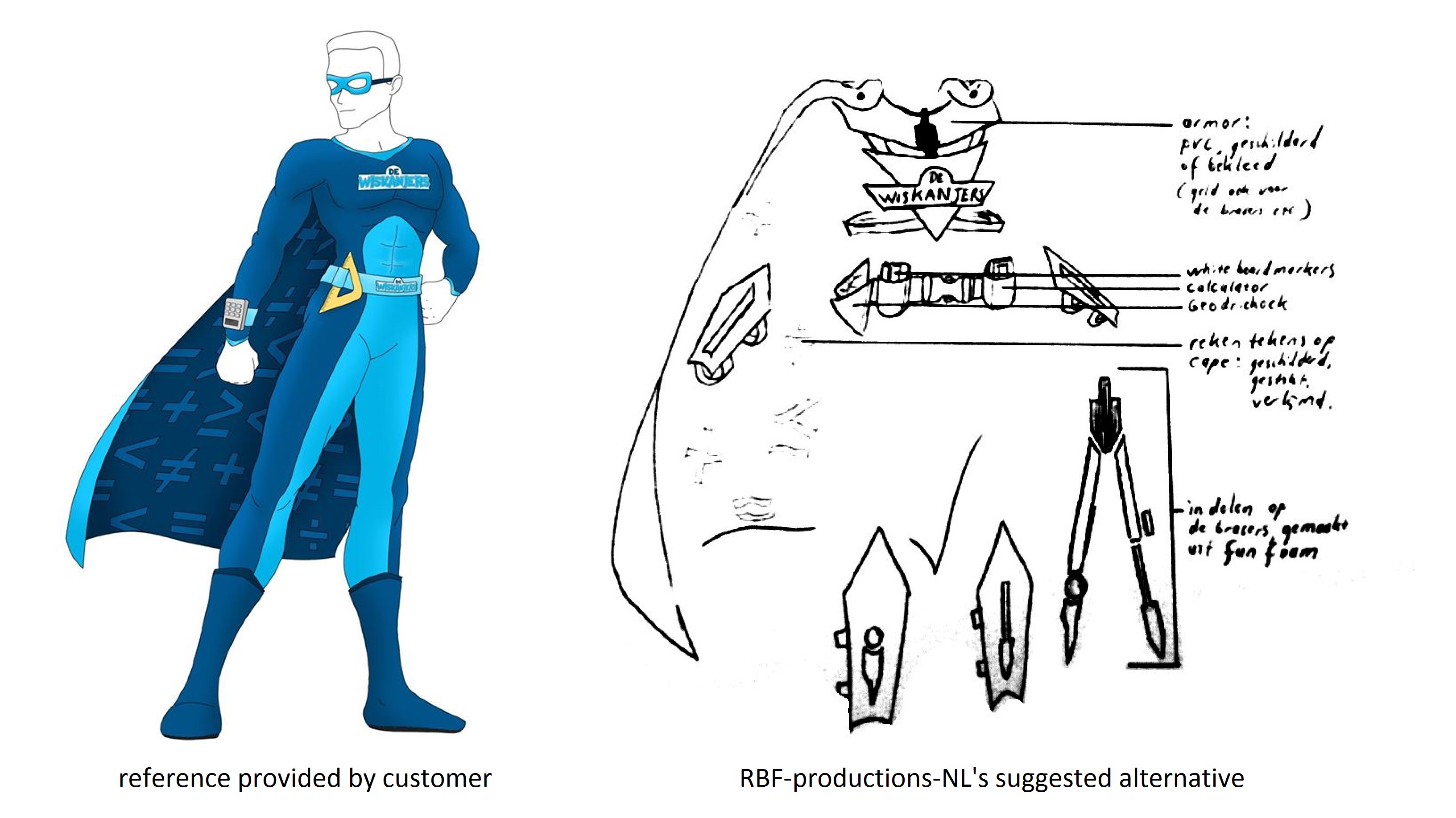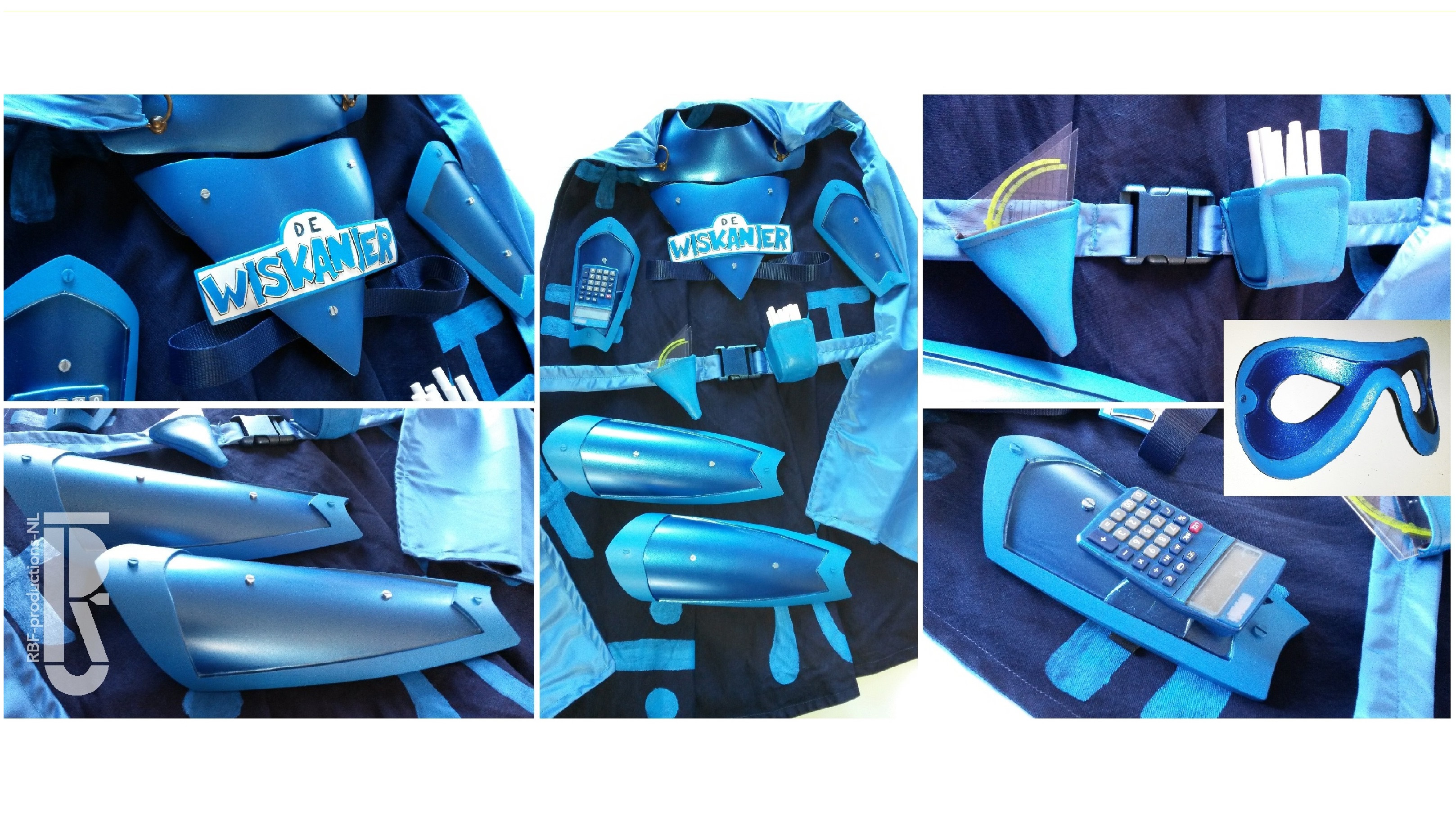 Wiskanjer This project is of a very different theme then RBF-productions-NL’s usual line-up. A Belgium company, New Media Group, requested the creation of a character’s costume that was going to be used for a new line of math books. The books were to be used at elementary schools. NMG send over a reference picture and told that the “Wiskanjer” would have to be worn by two different actors, wearing a muscle suit. RBF-productions-NL advised that it might be better to create a sort of harness that could be worn by any actor in any spandex kind of suit, with or without a muscle-suit. RBF-productions-NL then send over a sketch and after confirmation, began production on the “Wiskanjer”. |